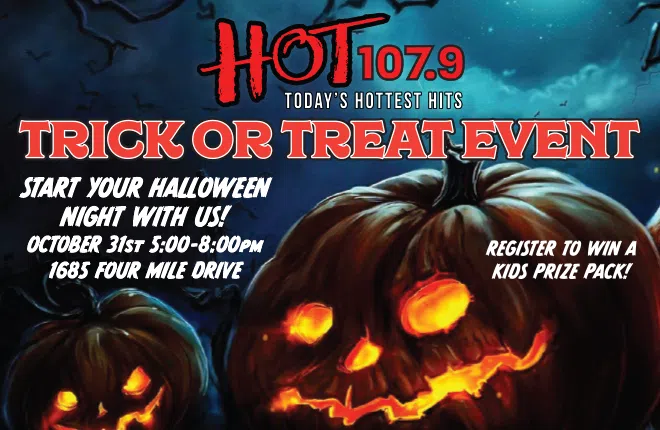 START YOUR HALLOWEEN NIGHT WITH HOT 107.9’S THIRD ANNUAL HOT TRICK OR TREAT FROM 5PM TIL 8PM AT THE CORNER OF 4 MILE DRIVE AND NORTHWAY ROAD.